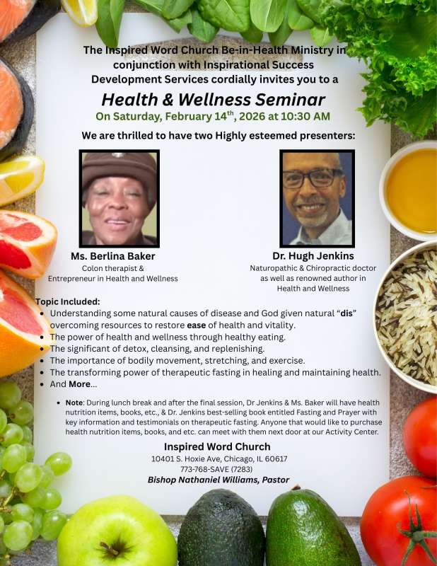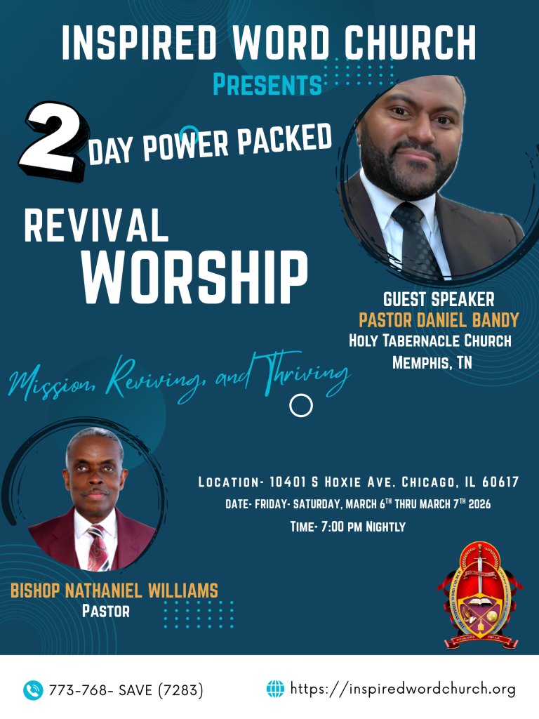 Praise the Lord! Praise the Lord in Jesus name! The Inspired Word Church is a church that is loving, concerned, compassionate, and structured to encourage, men and women to stand on sound doctrine through scriptural teaching. All are welcome to come and be with us, learn how to establish a relationship with the Lord Jesus Christ. The church is under the leadership and guidance of God Almighty, through a man after God’s own heart, in Bishop Nathaniel Williams. The church is located at 10401 S. Hoxie in Chicago Illinois 60617.